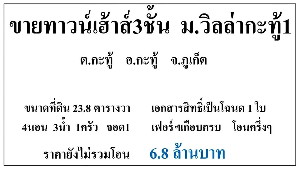 This house is located in the Villa Kathu 1 project. It is a 3-story townhouse situated on the main road of the village, providing convenient two‑way access. The house is fully decorated, extended, and ready to move in. Some furniture is included, except the bed. Parking for 1 car inside the house and 1 car in front is available. With 4 bedrooms it can accommodate a large family of 6‑8 people or be used as a home office. The location offers easy access to Lotus and Central Festival malls within 5 minutes. Transfer fees are split 50/50 and there is a specific tax. The asking price is 6,800,000 THB.